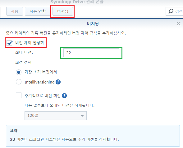 4. 백업되는 버전 수는 디폴트 값 32로 설정되어 있다.