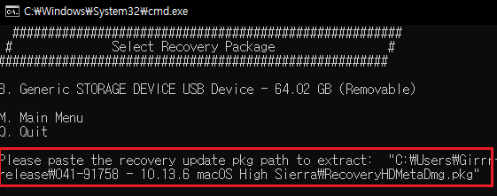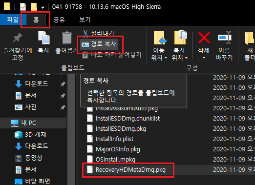 - RecoveryHDMetaDMG.pkg가 필요하며 이 파일의 경로를 복사해서 실행중인 입력창에 붙여넣고 엔터 입력