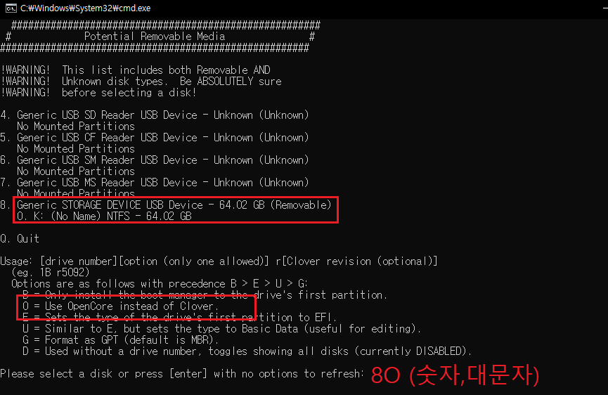 - 설치가 필요한 USB(8번)와 오픈코어 방식을 사용하기 위해 O 옵션을 사용할 것 : 8O (소문자도 상관없는듯하다)