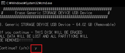 - 엔터를 입력하면 포맷 경고창을 띄우는데 y로 계속 진행함.