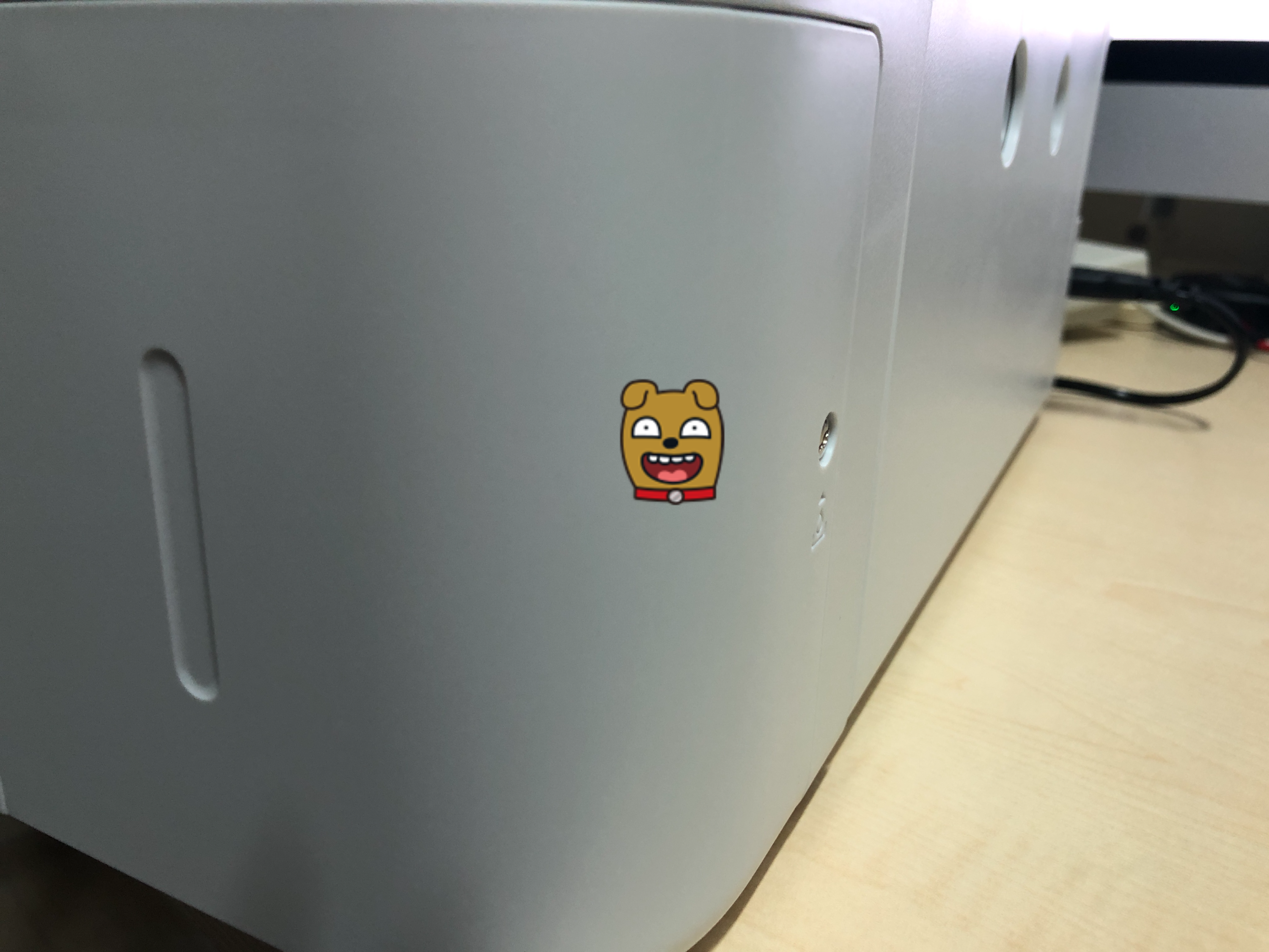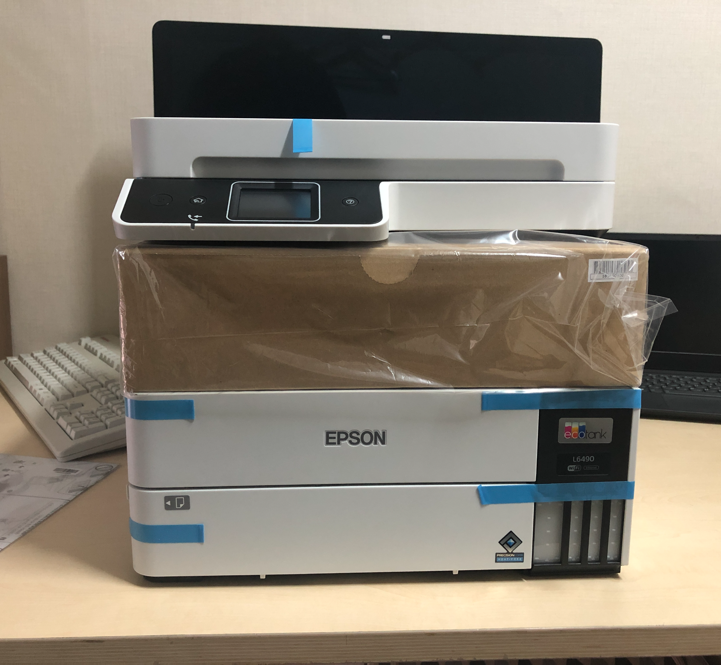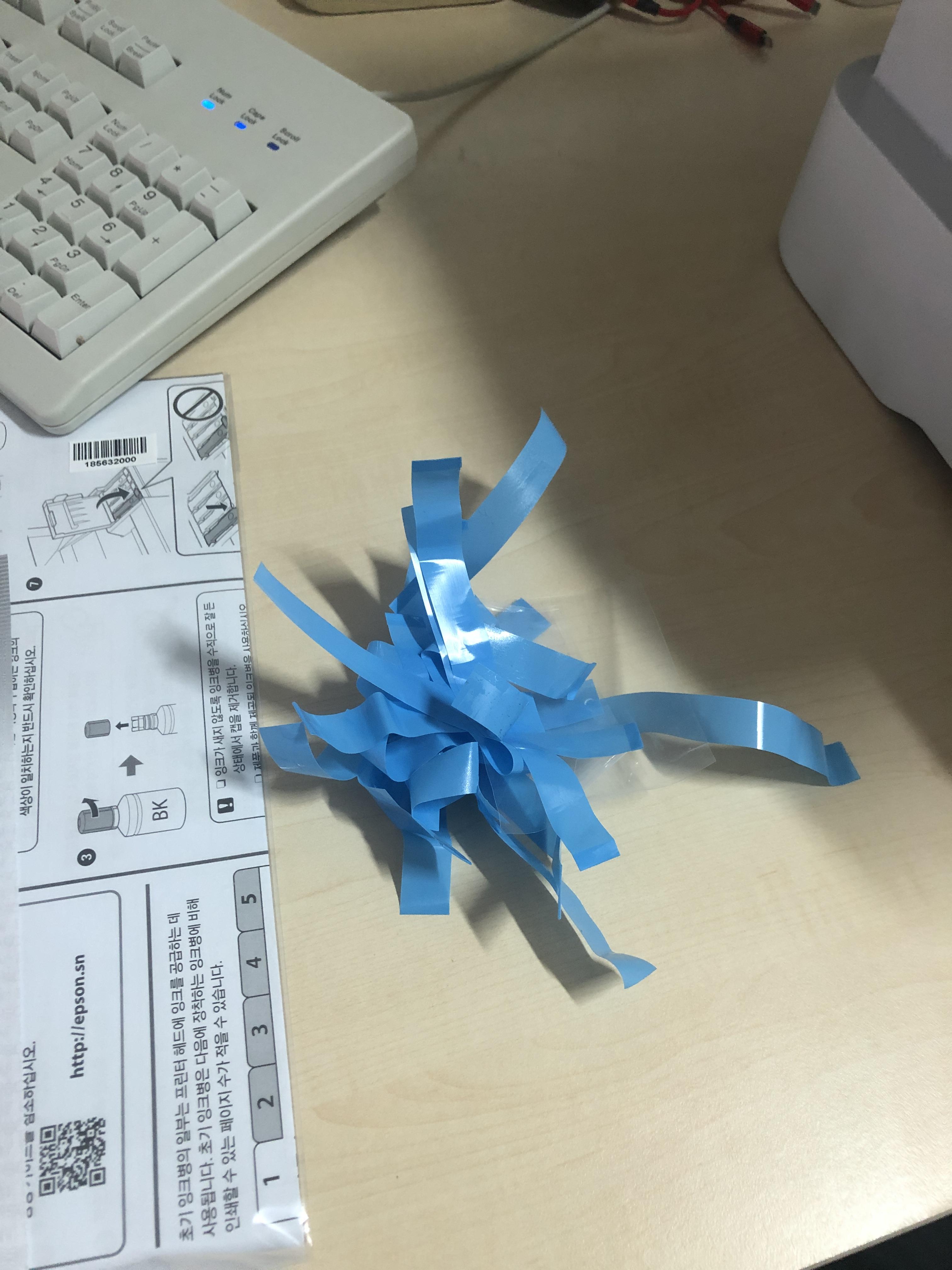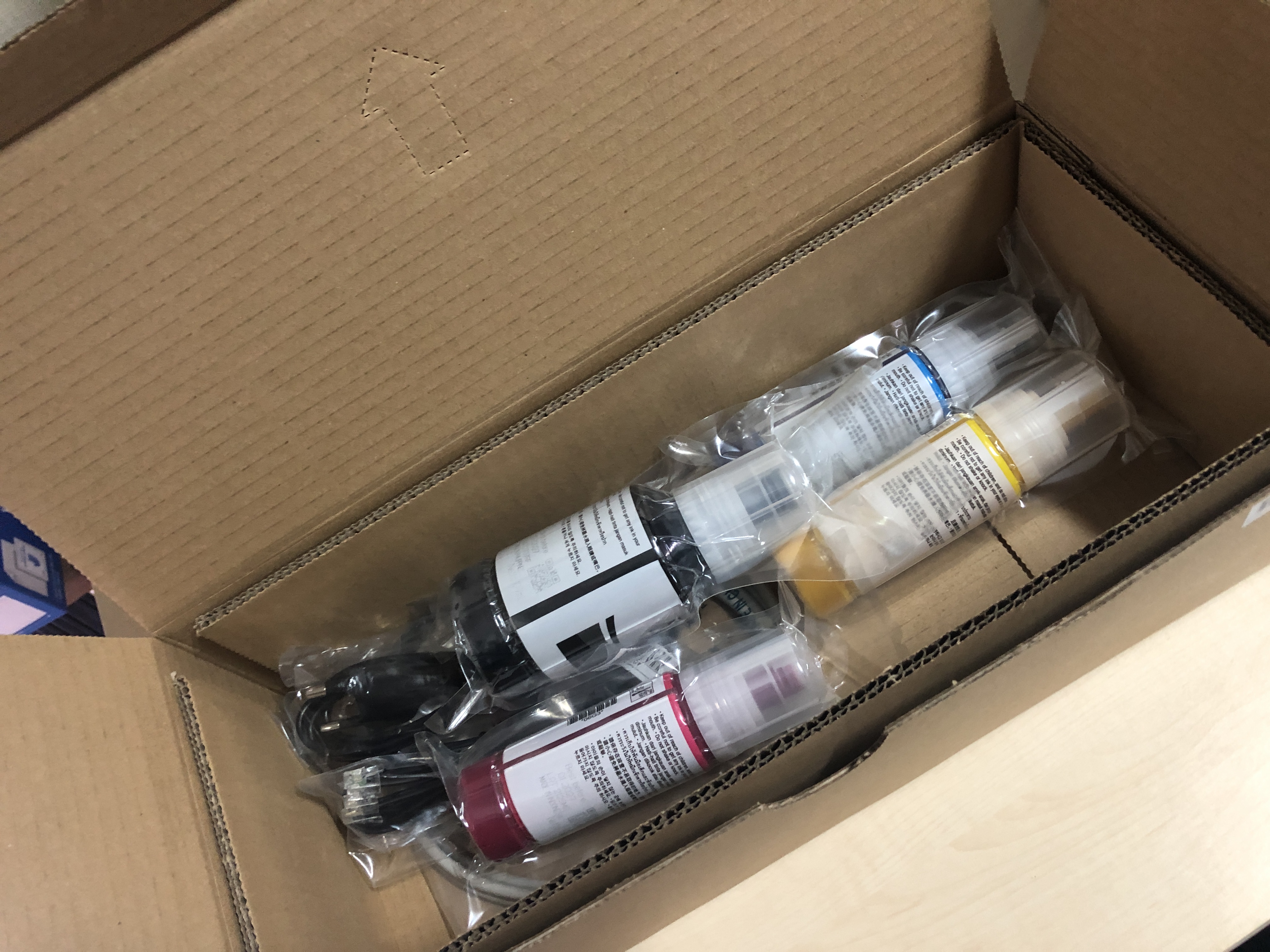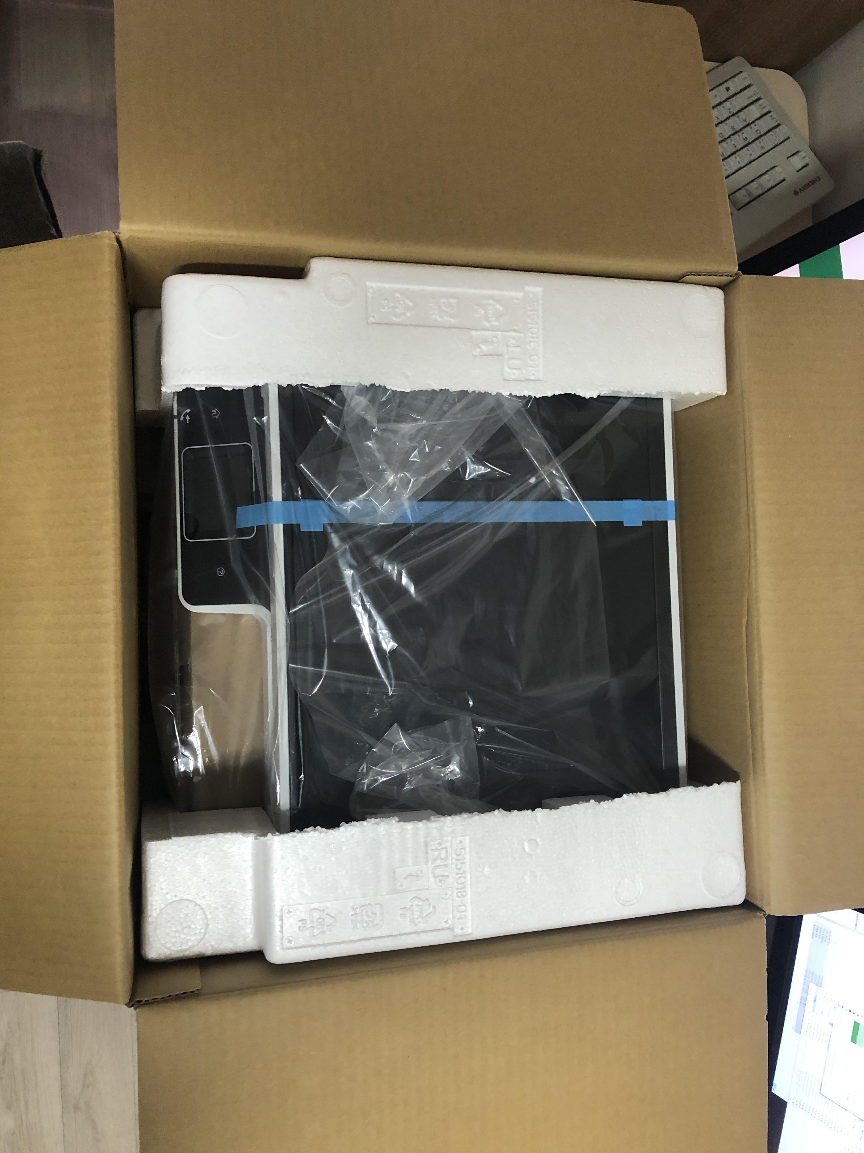 프린터 사이에 껴있는 박스는 주변기기 박스인데, 나중에 A/S를 받게 되는 경우를 대비해서 갖고 있자.
