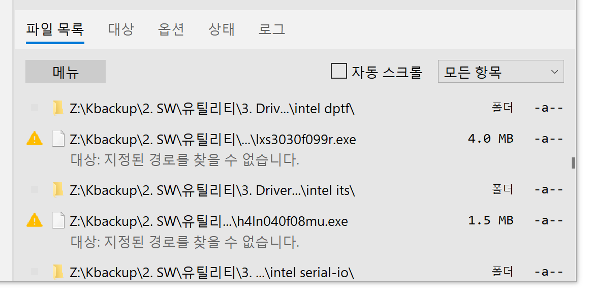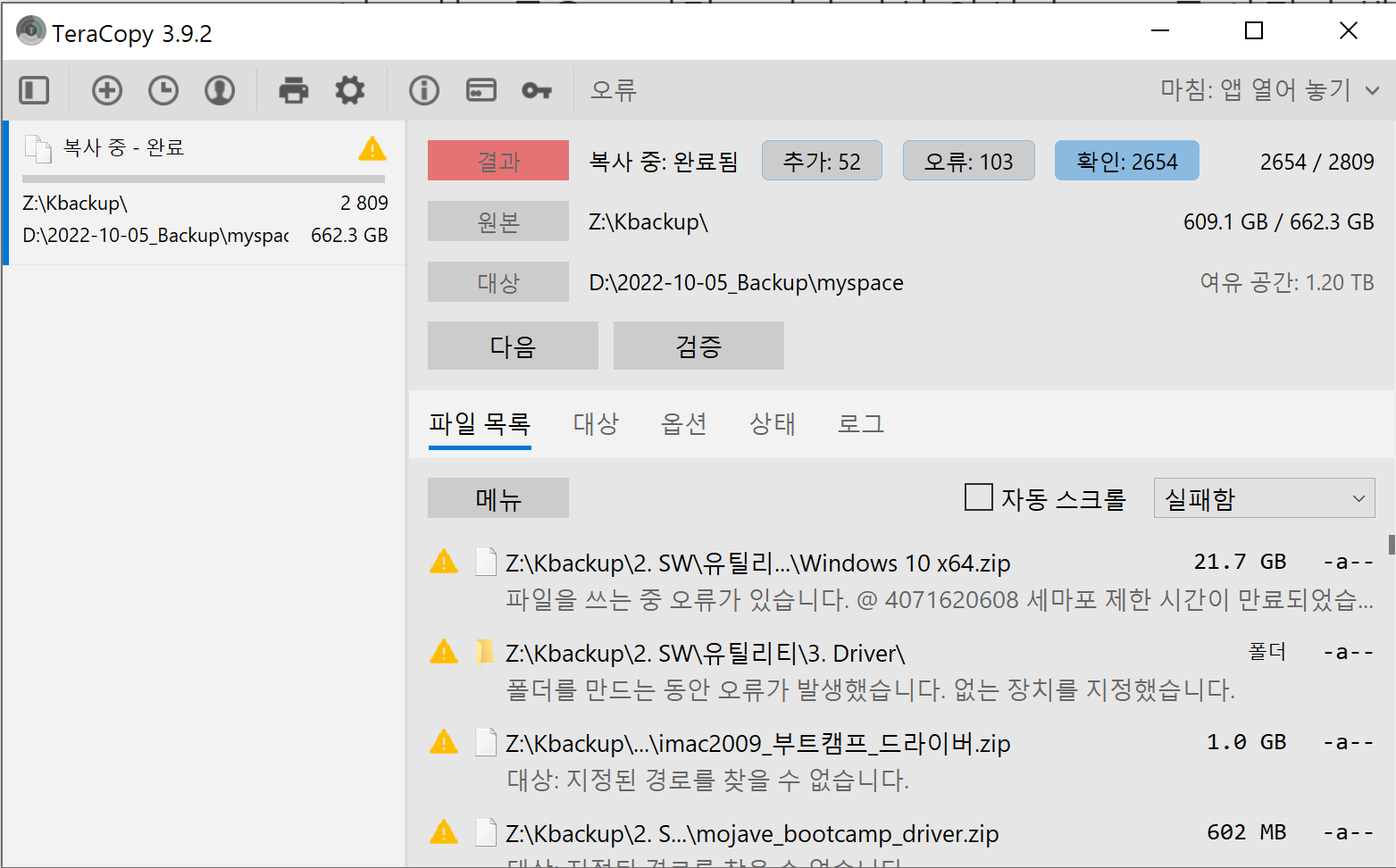 Copy 과정이 완료되면 이렇게 에러난 파일들을 리스트로 볼 수 있다.