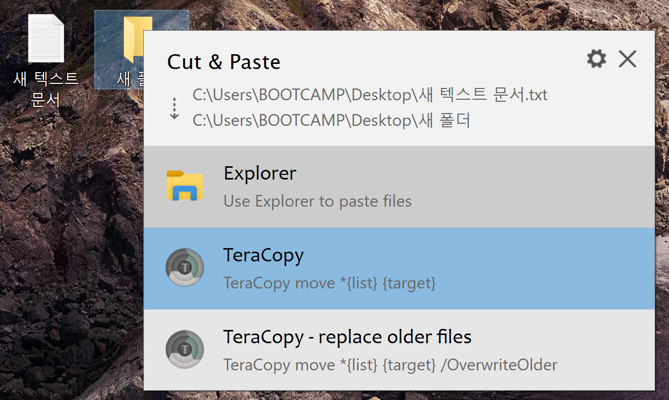 copy할 파일 및 폴더에서 우클릭으로 테라카피를 선택하는 방식