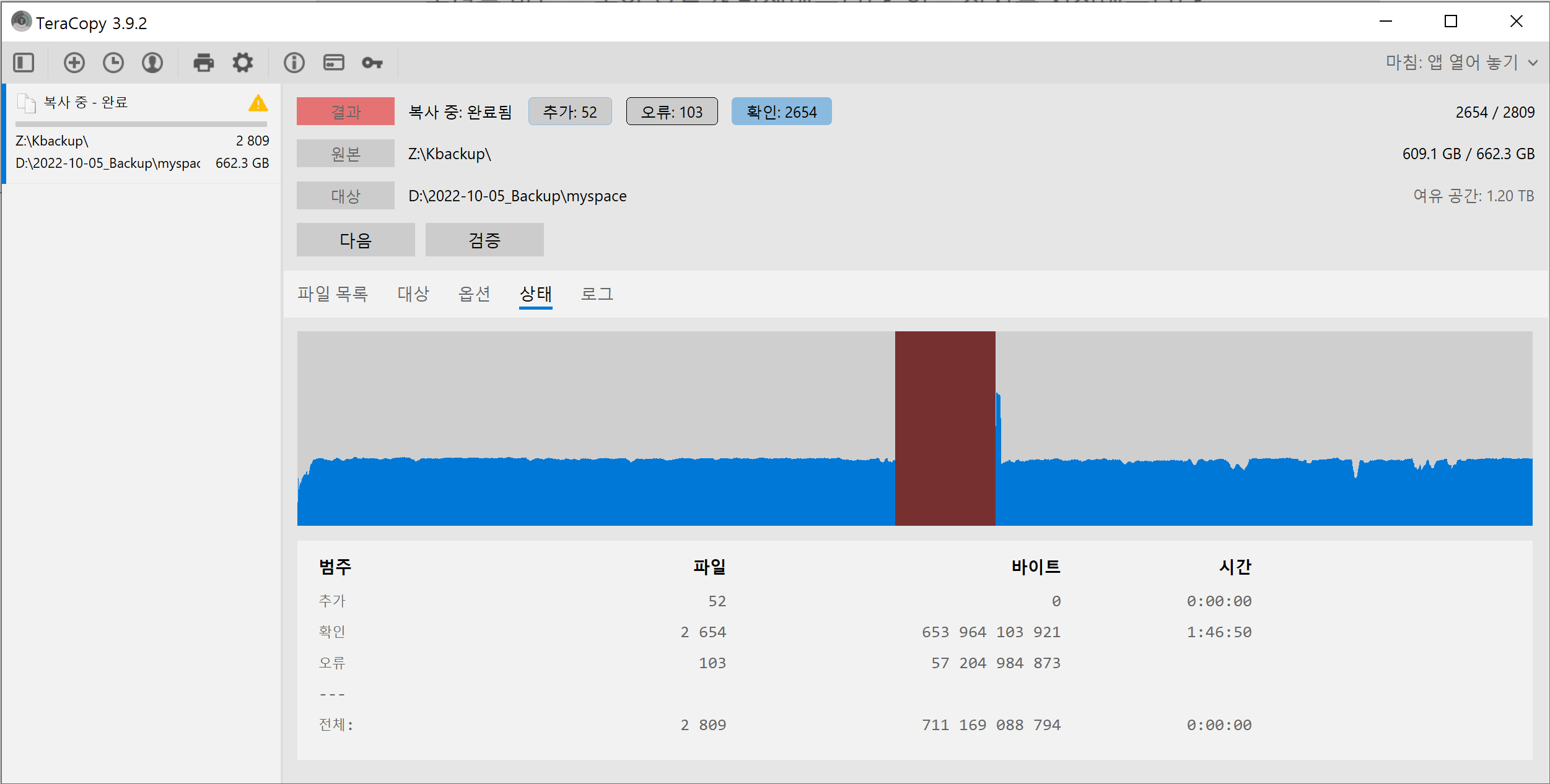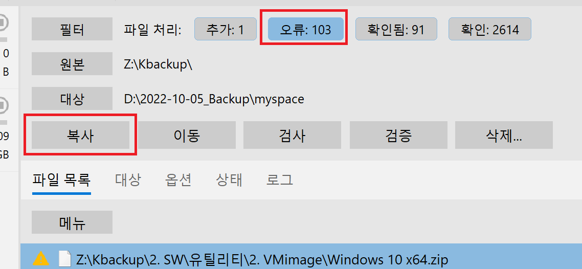 '검증'은 복사과정이 완료되고 양쪽 파일간의 신뢰성 체크가 필요할 때 눌러주면 되겠다.