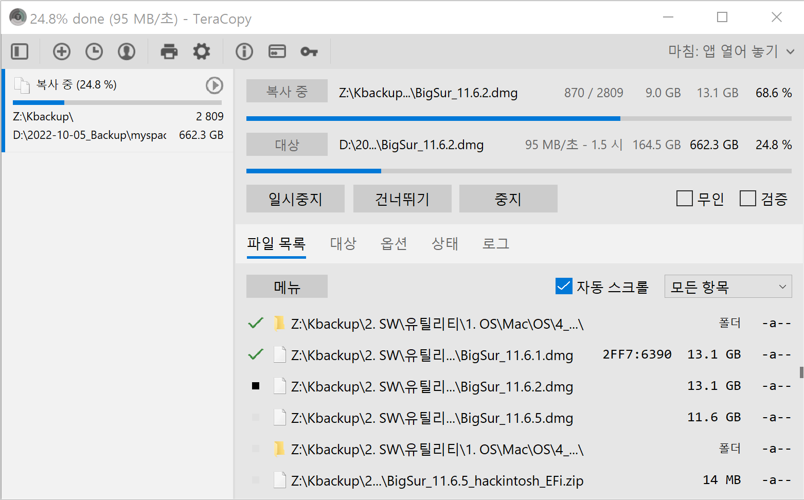 복사 속도, 예상 완료시간, 전체/부분 진행률 등을 확인할 수 있다.