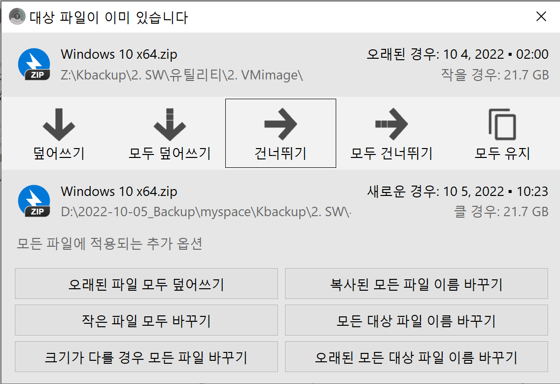 드라이브에 같은 파일이 존재할 경우 이렇게 뜨는데