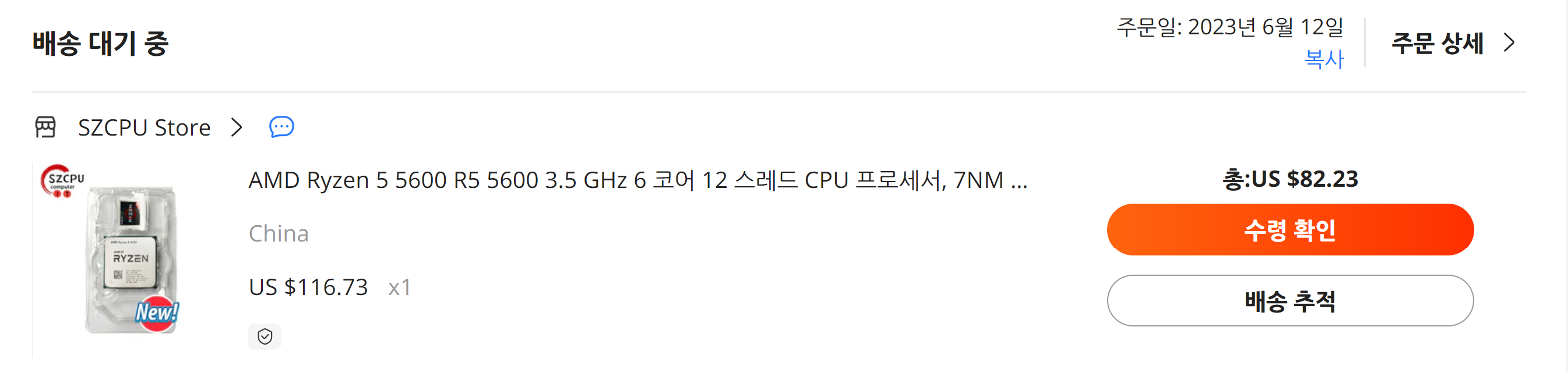 CPU 가격은 82.23달러 수수료까지해서 108,000원정도