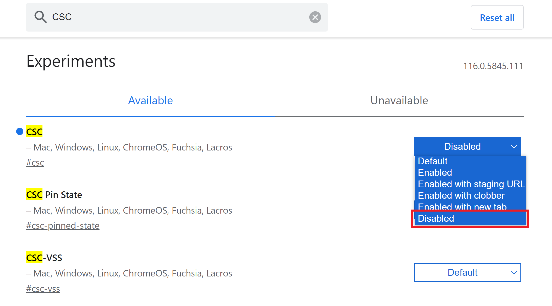 실험실이 열리면 검색에다가 'CSC'을 입력해주고 CSC를 Default에서 Disabled로 변경한다.