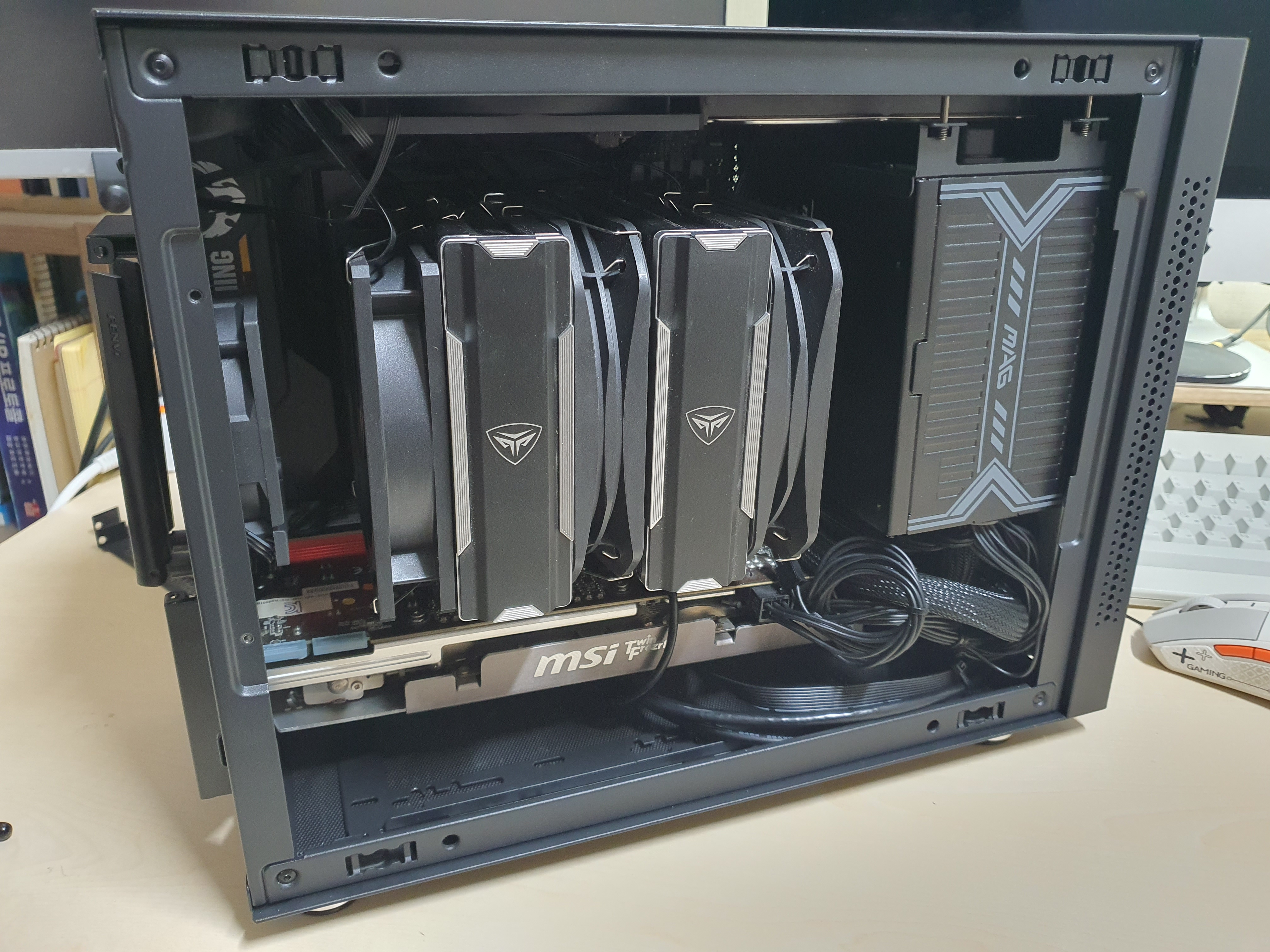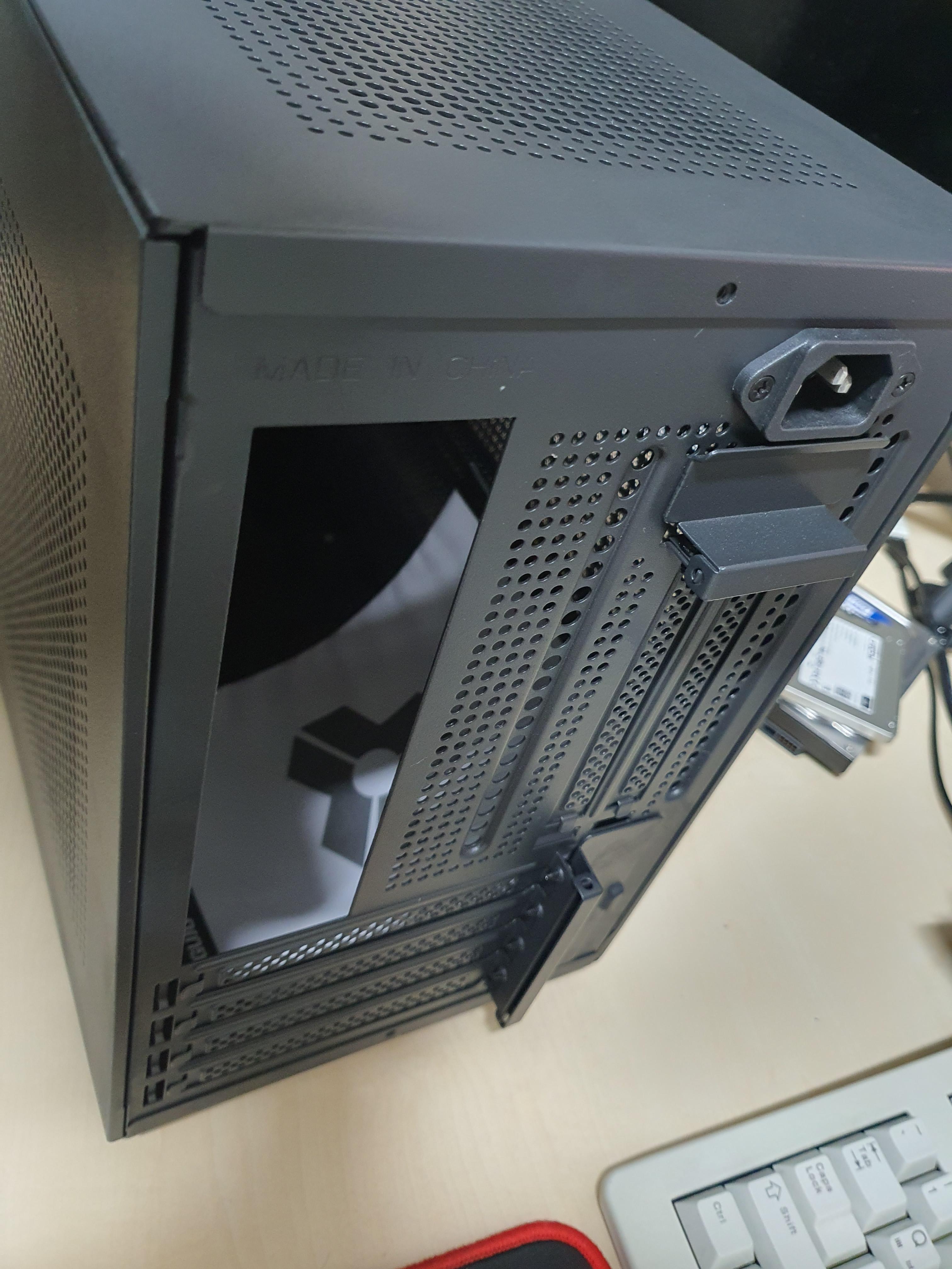 파워는 SFX에서 ATX 파워까지 지원하는데 ATX 파워를 그대로 사용하게 되면 상단 간섭이 생겨서 상단 120mm 팬 2개 중 하나만 활용해야 하는 상황이 발생한다.