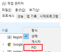 > 메뉴 - 보기 - 열 선택 - PID(프로세스 식별자) 체크
